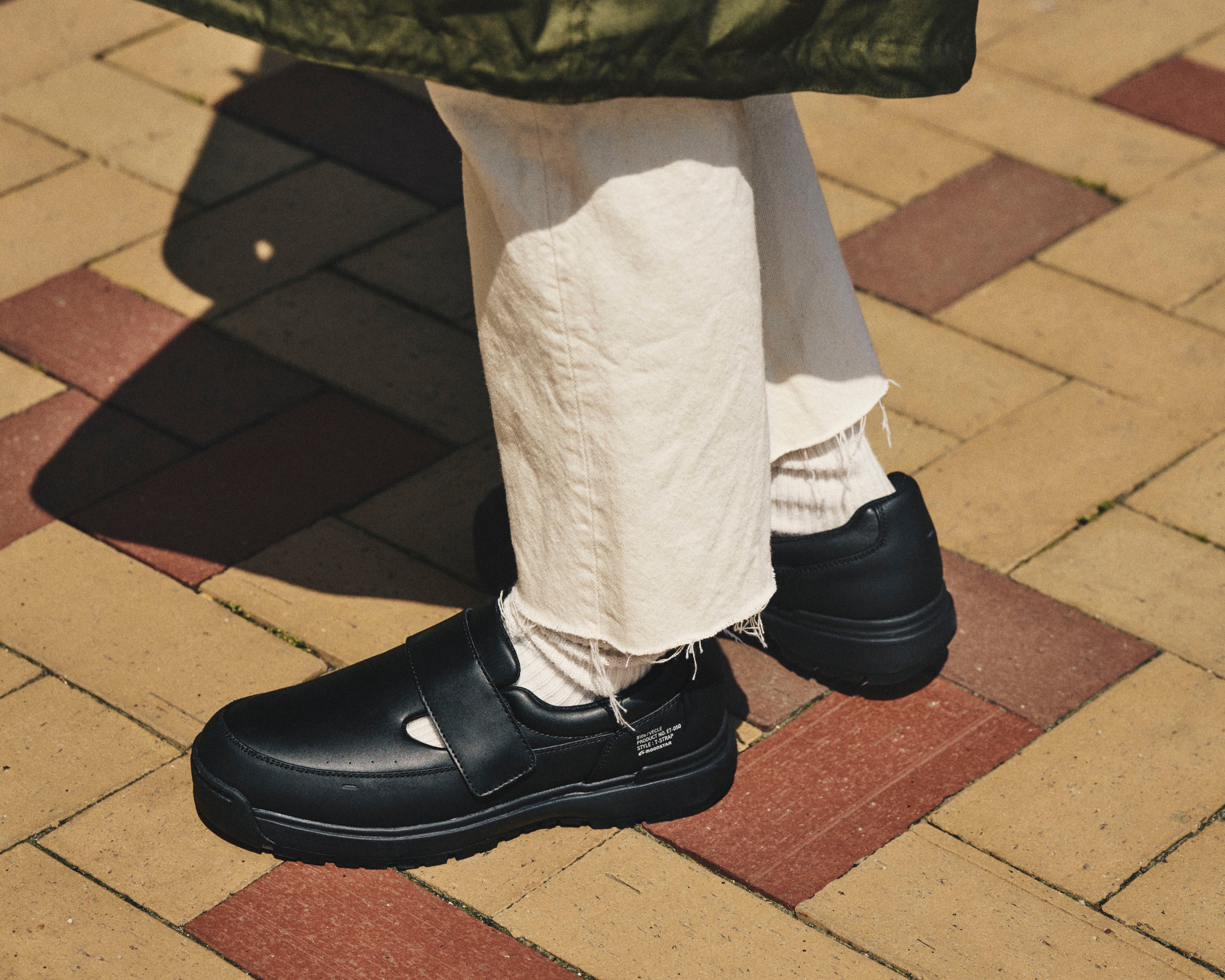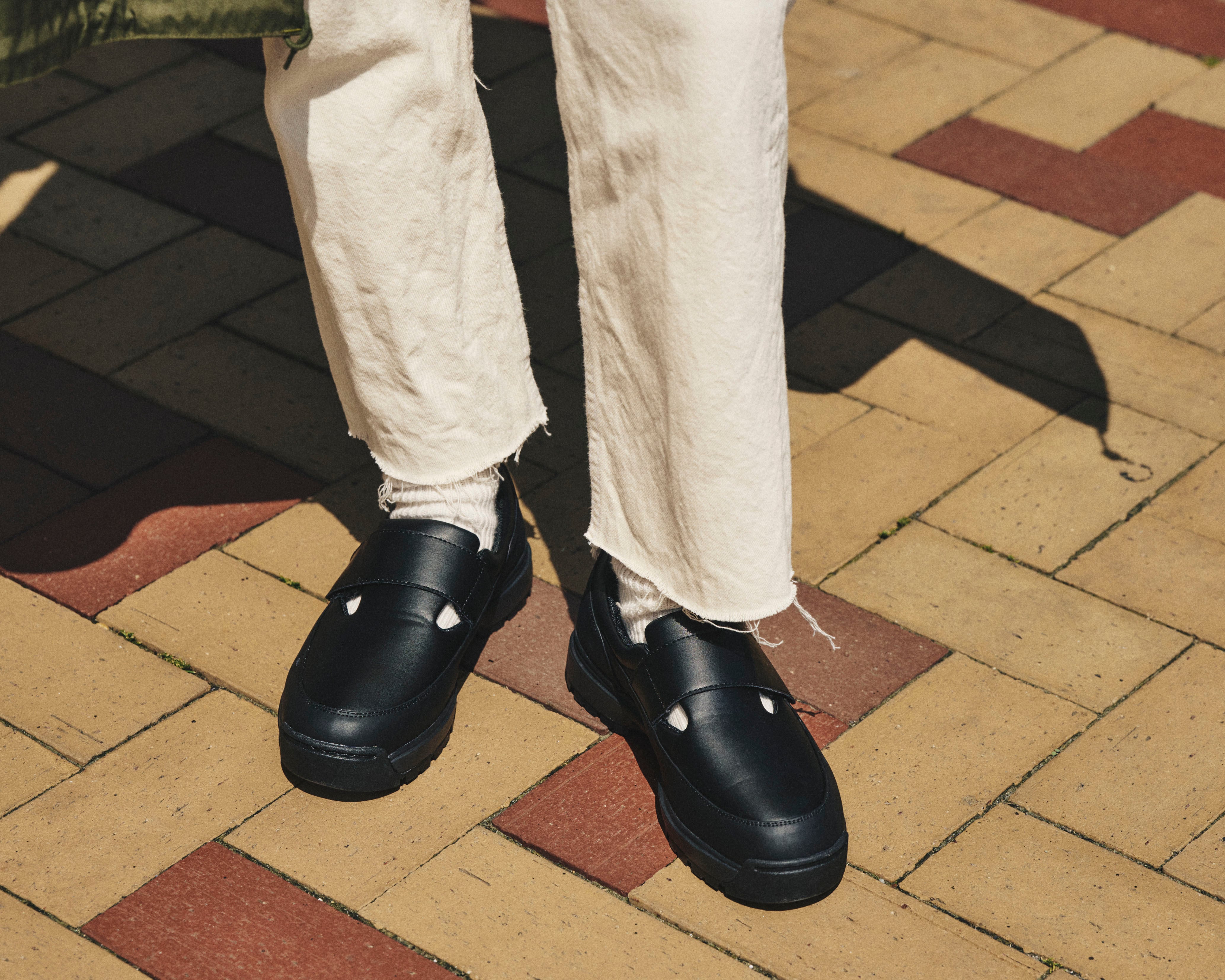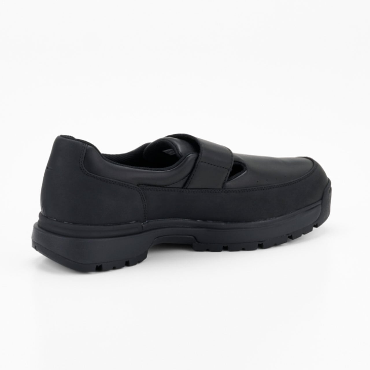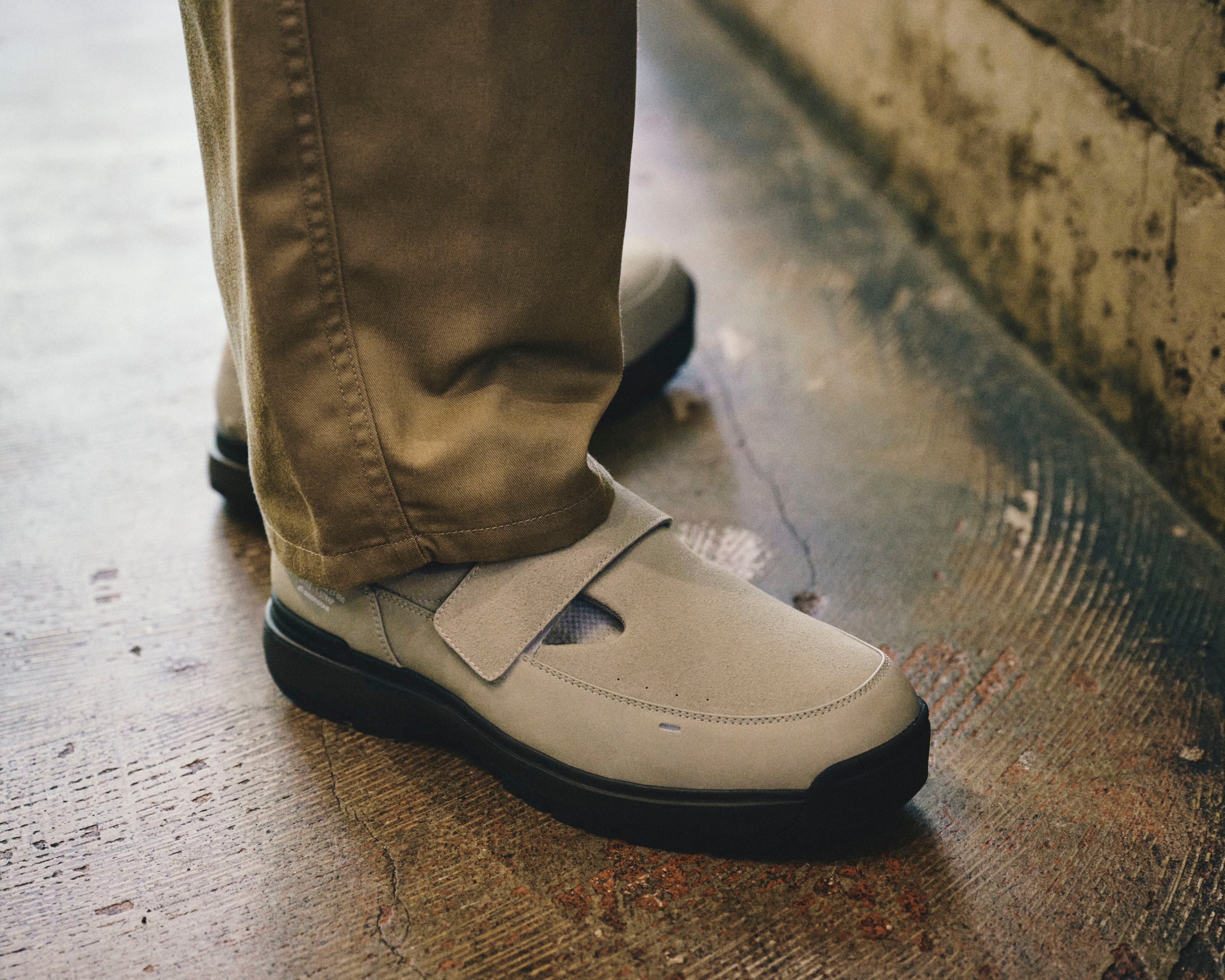 面ファスナー仕様の甲バンドを搭載し、脱ぎ履きがしやすい設計。