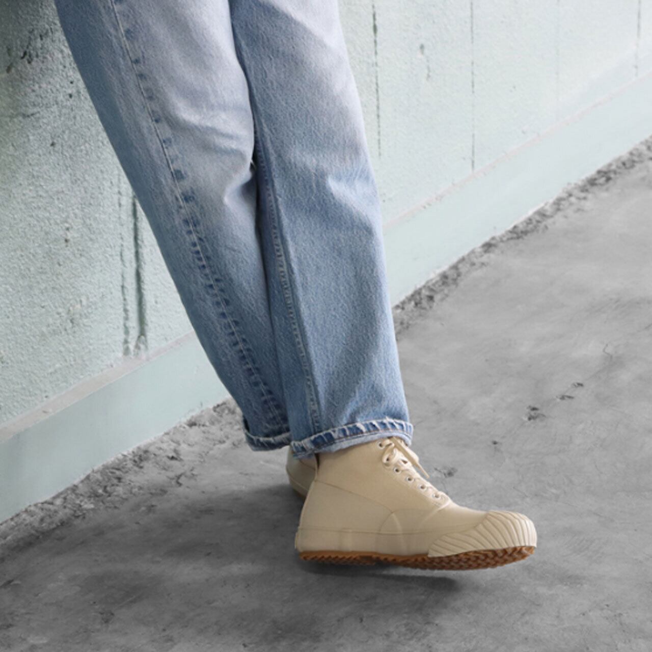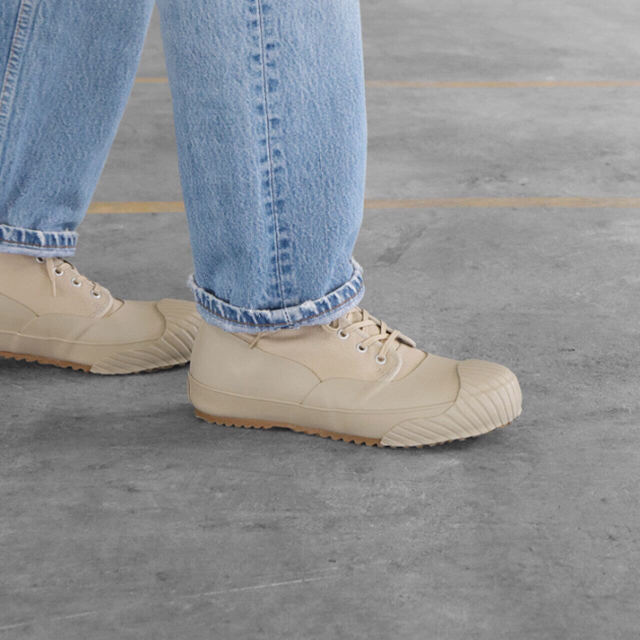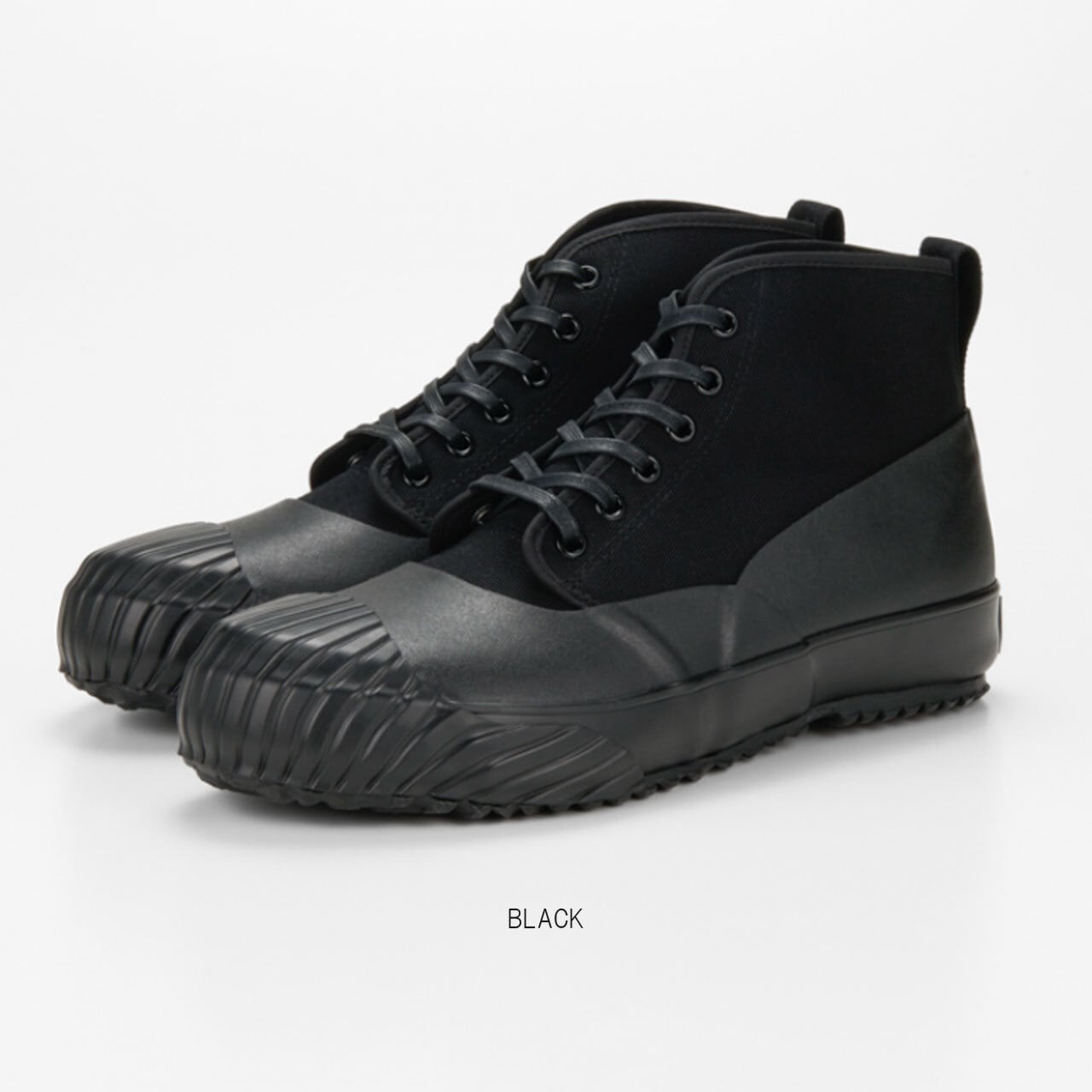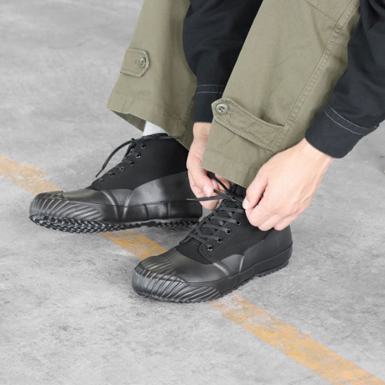 アッパーのキャンバス地にラバーを貼り合わせた全天候型モデル。