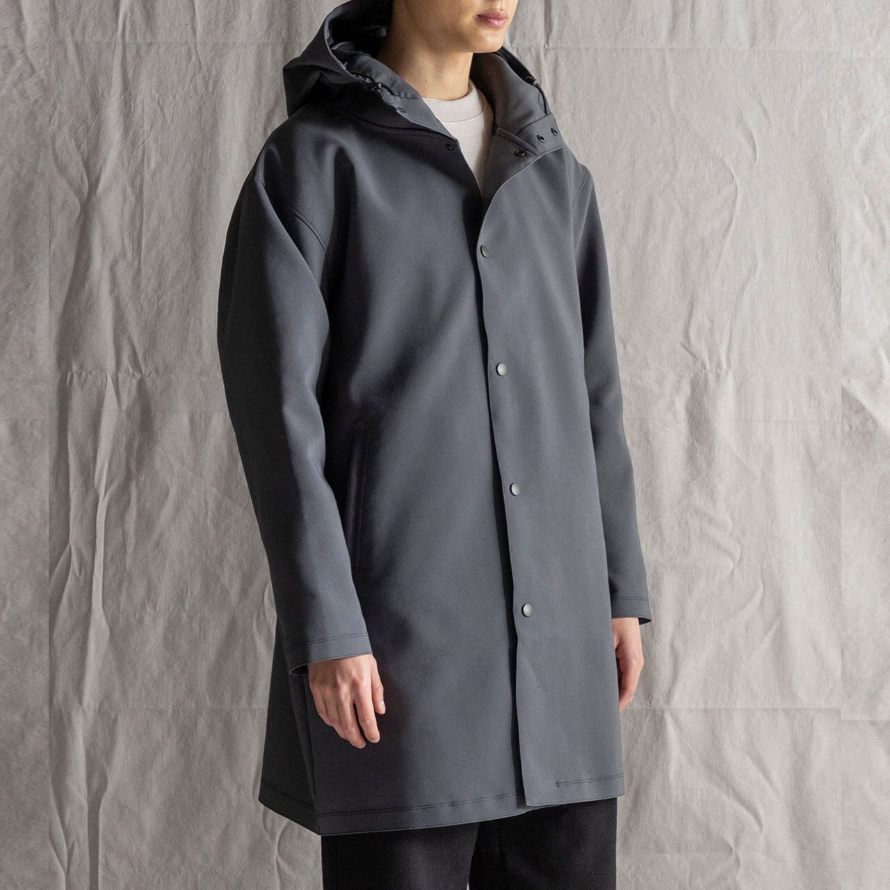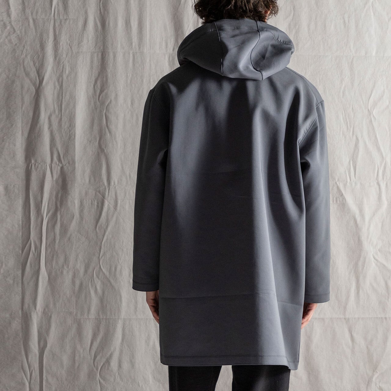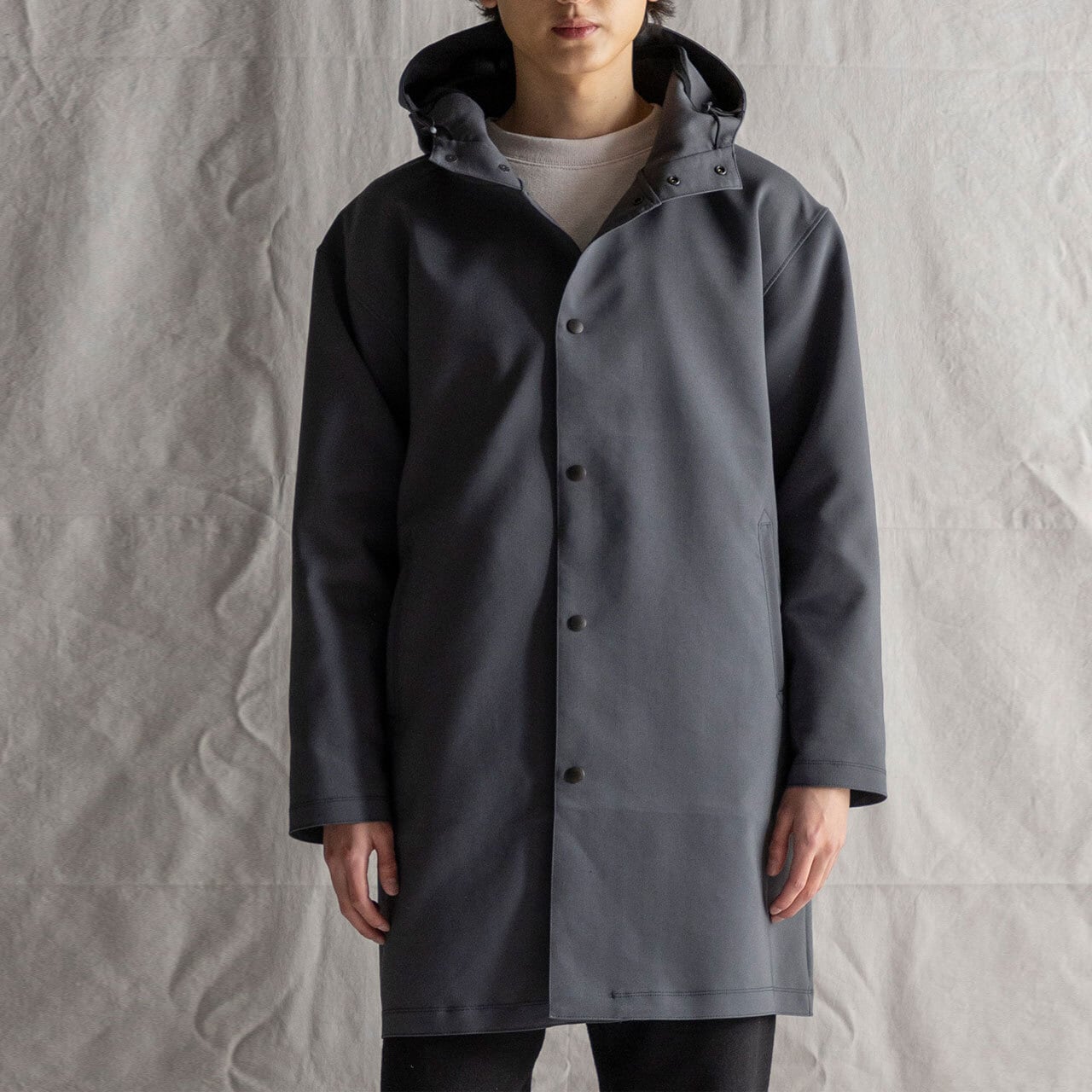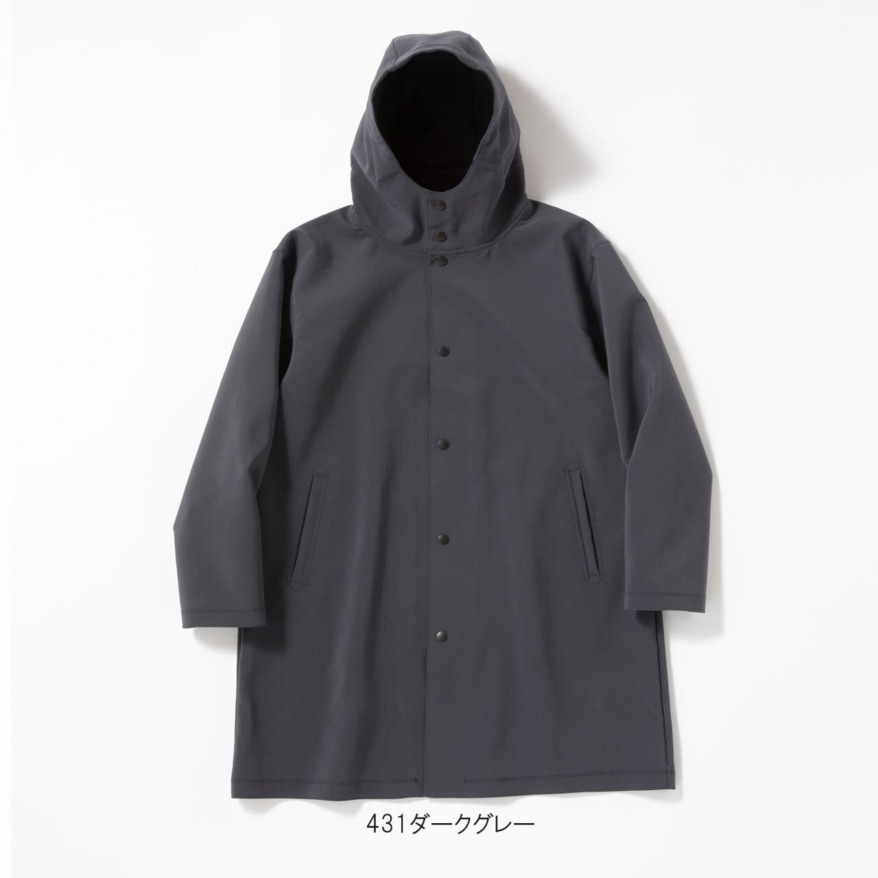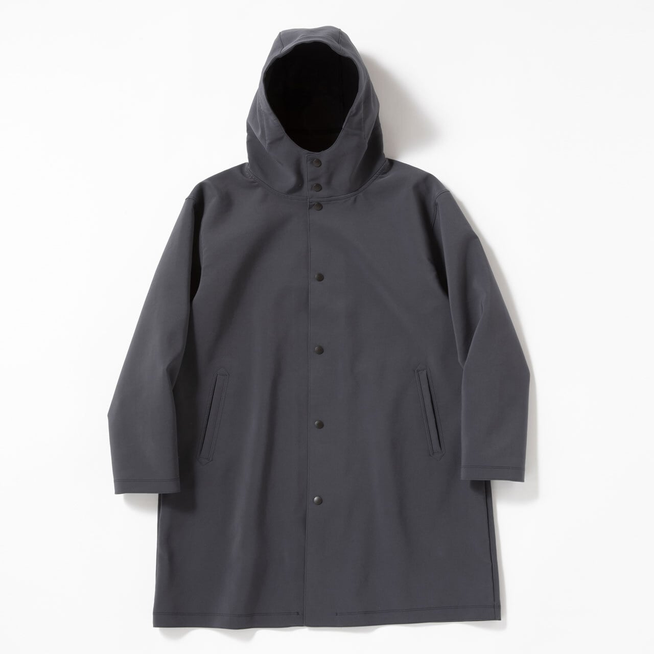 50/2の太番手の綿糸とストレッチ糸を交織して高密度に織り上げたトリプルクロス素材のフーディーコートです。