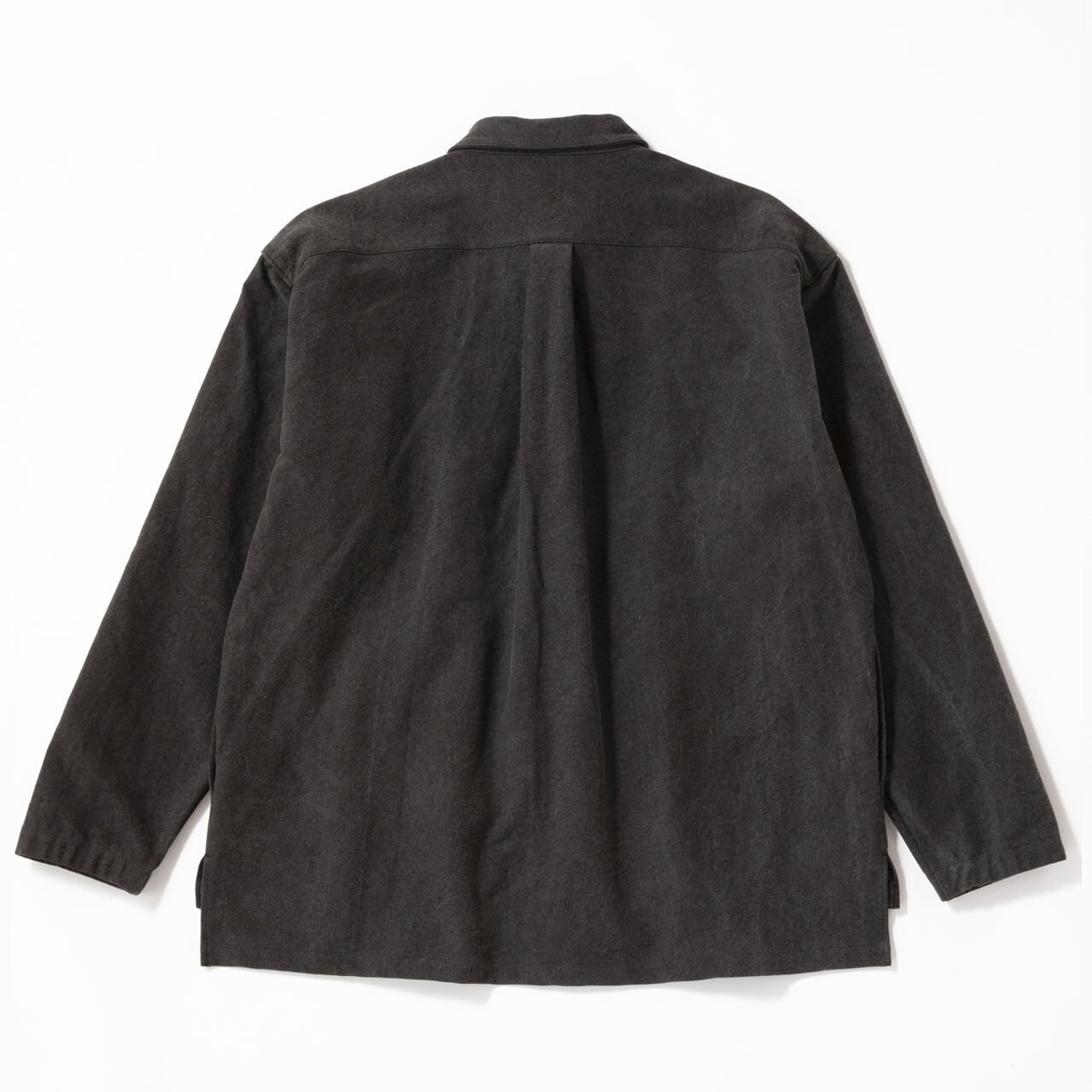 独特な抜け感のある表情に仕上げました。デザインはBaseballの監督やコーチが羽織るシャツを参考に肩パーツ2重使い、背中のプリーツ、裾の段差といったシャツの意匠を取り入れながらアウターとしての着用を想定してリングドットボタン、サイドシームポケット、袖口ゴムシャーリングといった機能的な部分も加えました。