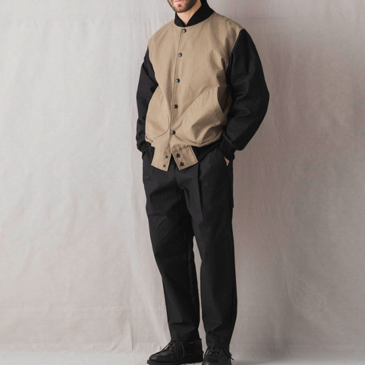 襟、袖口、裾のリブは身頃のバックネップに合わせてGGスウエット同様の綿100%素材を使用して全体のバランスを整えました。