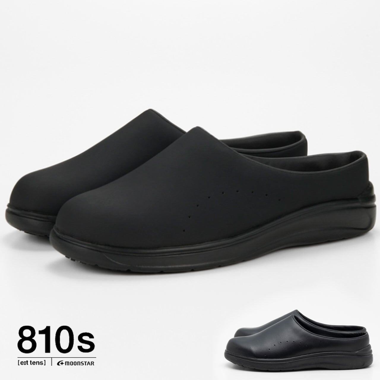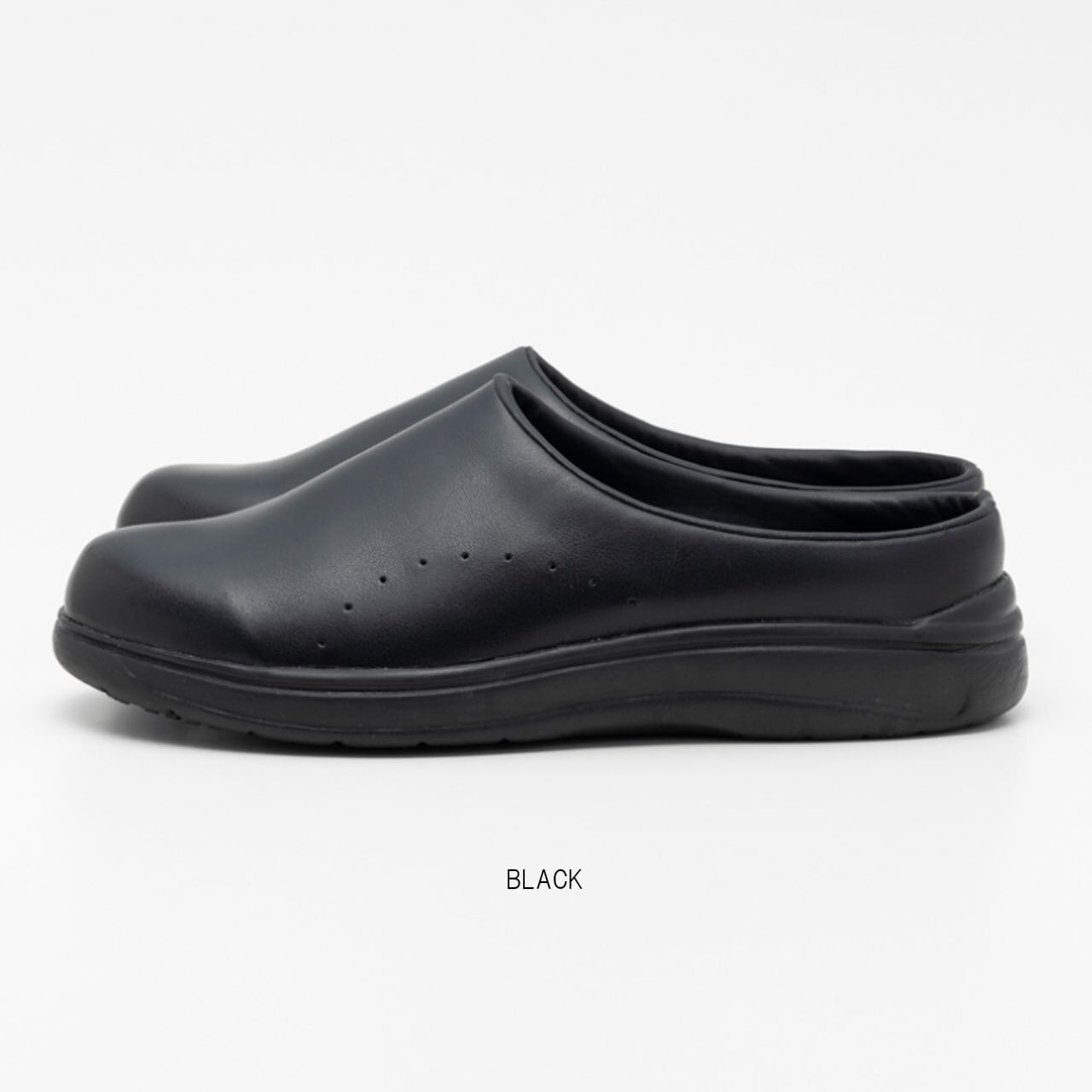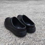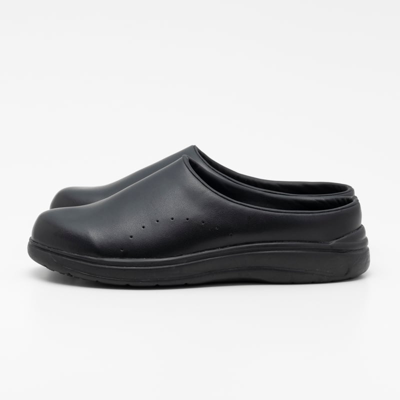 油や水に濡れた床面に吸い付くマルチストッパーソールや手入れが楽なアッパー素材を採用。落ち着いた印象のサボタイプ。
